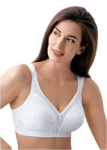 This bra by Playtex features thick comfort straps that prevent strap dig-in and a floral deluster print fabric with scalloped, lace accents. It has a three-row, double back closure.