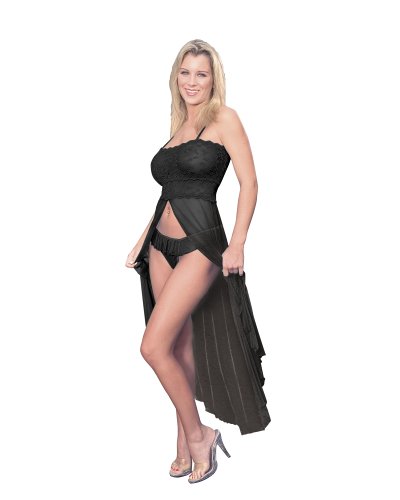 Floral lace bodice with long fly away train back, sheer mesh and matching flutter thong.