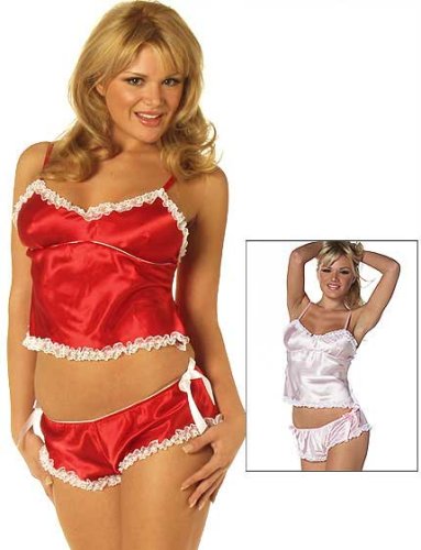 Demure and delicate this sweet 2 piece charmeuse satin camisole features a gathered cup slip bodice with split edges and adjustable straps. The matching boy leg short dips low to expose your belly button. Lace ruffle "icing? around the edges makes this set intoxicatingly feminine. Darling satin bows at each hip add the perfect finishing touch.